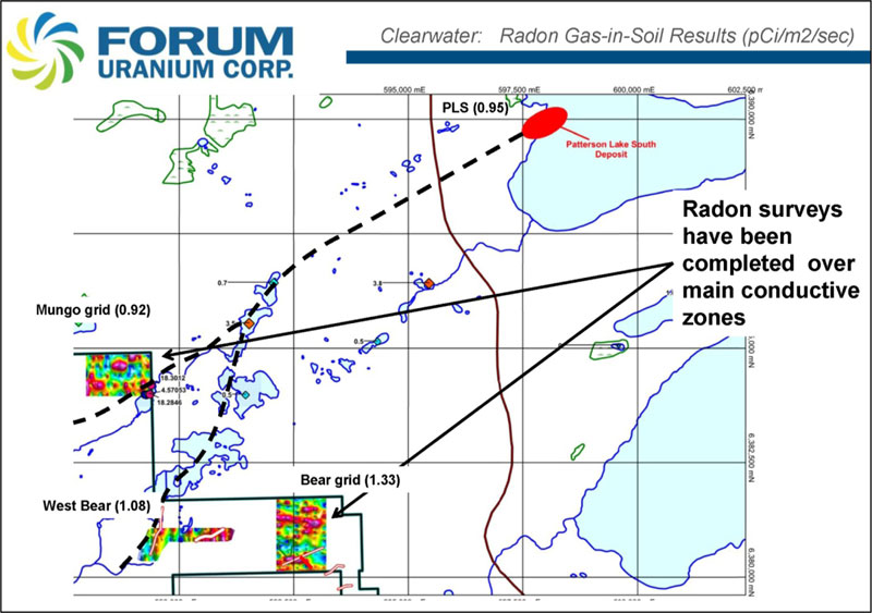 Vancouver, B.C., October 22, 2013 - Forum Uranium Corp. (FDC: TSX-V) is pleased to announce results from a radon survey on its 100% owned Clearwater Project on trend and immediately adjacent to the southwest of the Alpha Minerals/Fission Uranium Patterson Lake South (PLS) discovery. Forum conducted soil gas radon surveys over three different grid areas in August and September. Five water samples were also taken on the northern grid with very positive results.