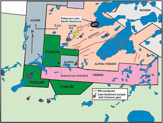 Vancouver, B.C., July 3, 2013 - Forum Uranium Corp. (FDC: TSX-V) is pleased to announce the completion of an electromagnetic and magnetic survey on its 100% owned Clearwater project on the claim boundary immediately southwest of the Alpha Minerals/Fission Uranium Patterson Lake South uranium discovery (see Figure 1). Preliminary results from the survey confirm that the fertile conductive trend that hosts the high-grade uranium discovery on the Patterson Lake South project (the “Patterson Lake Conductor”) extends on to Forum’s property. As a result, Forum increased the survey to fly the property in more detail for better resolution of the conductive corridor.