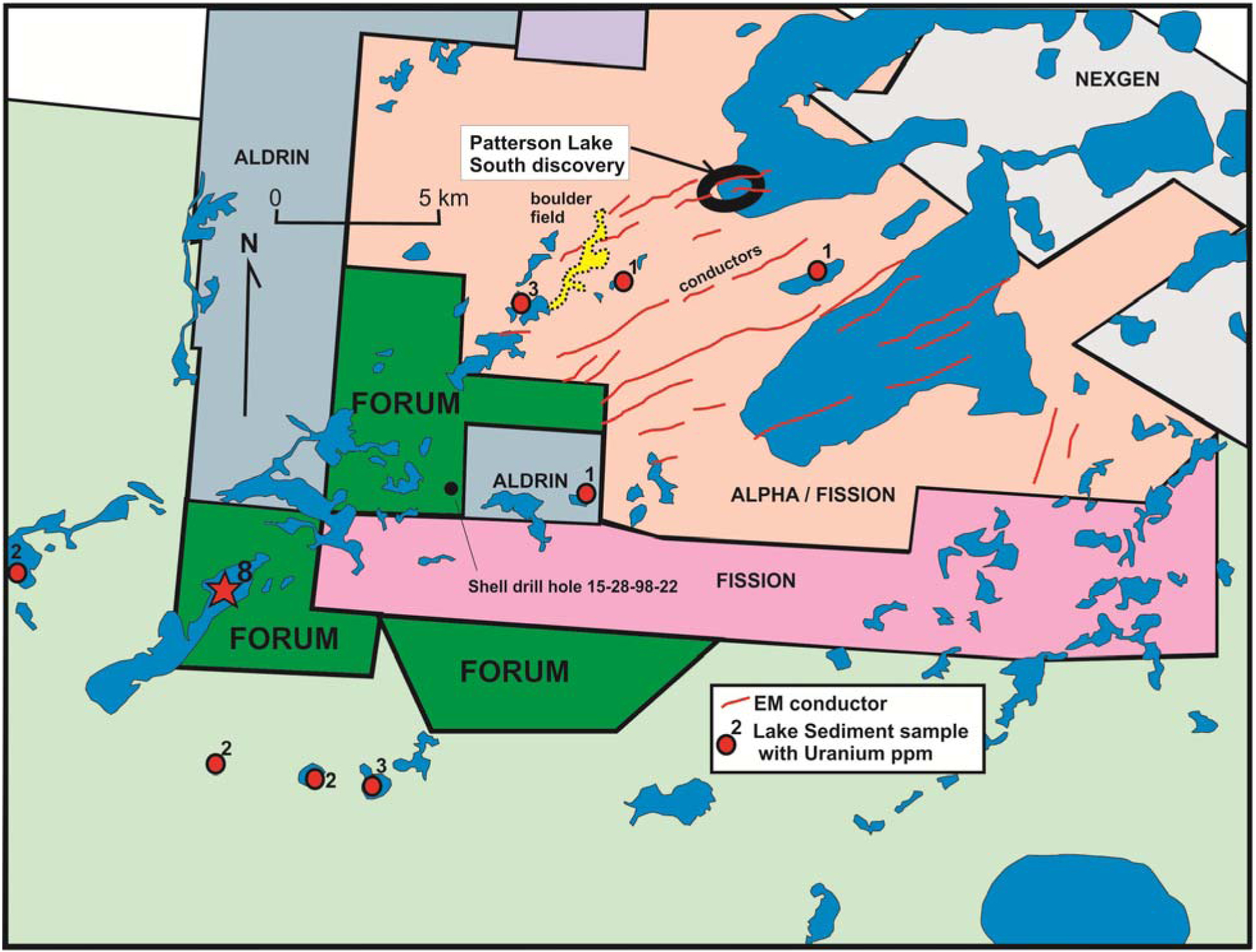 Figure 1: Forum’s Clearwater claims in the Patterson Lake area. Note that the highest uranium lake sediment anomaly occurs on Forum’s property.