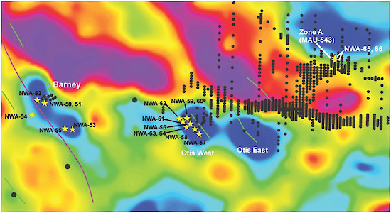 Hole NWA-63 intersected 40 metres of anomalous radioactivity from 131 metres to 171 metres with an off-scale peak (>9,999 cps) over 0.1 metres at 143.3 metres. This zone was intersected up-dip by NWA-56 and down-dip by NWA-64, showing a vertical extent of anomalous radioactivity of at least 120 metres. Further drilling is strongly recommended for both the Otis West and East targets.