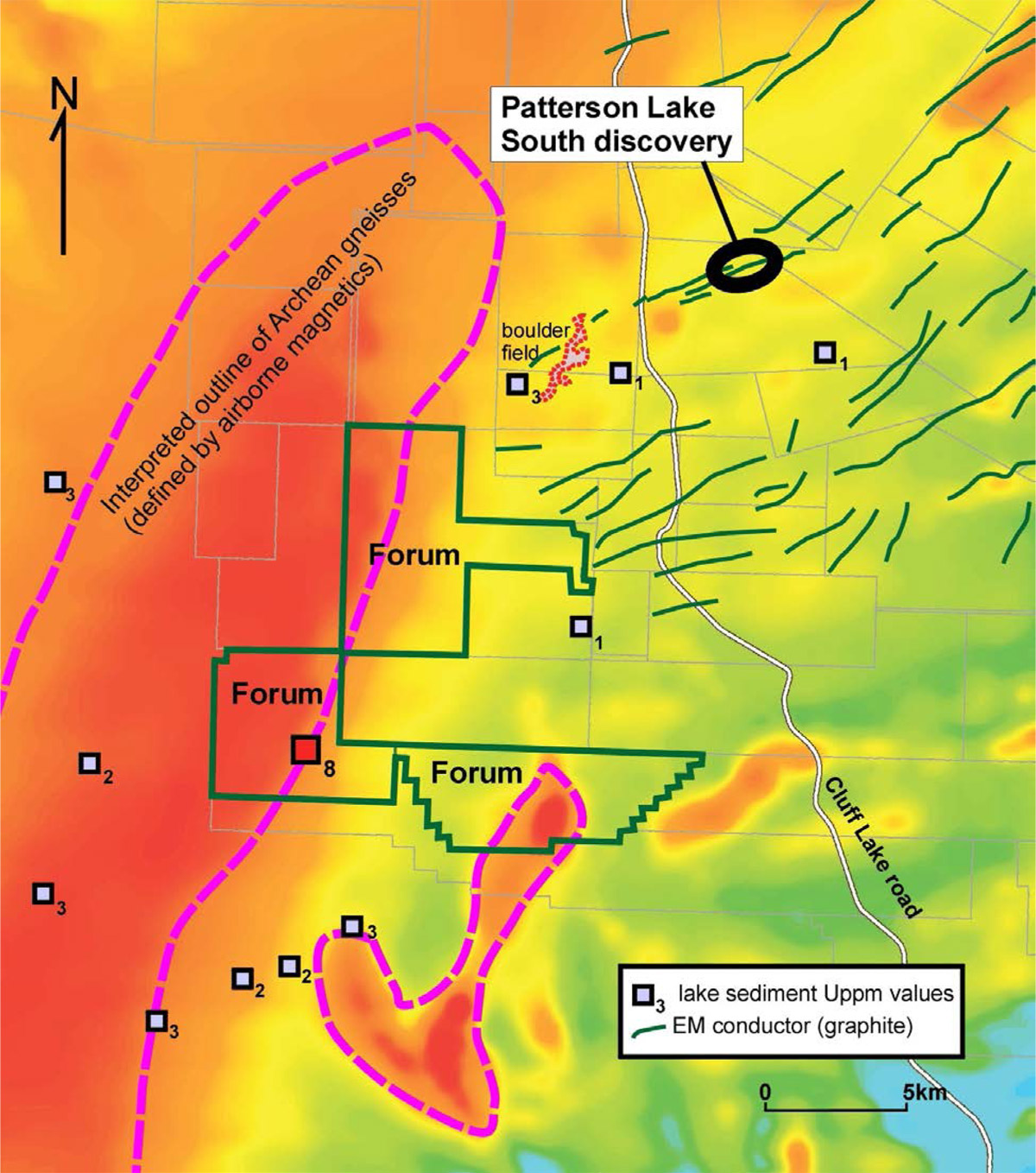 A historic regional lake sediment sampling program was conducted over the Patterson Lake area. The highest lake sediment value in the area lies in the southwest Forum claim (Figure 1 below) with a value of 8.3ppm. Most values are between 1ppm to 3ppm. Regional airborne magnetic data (Figure 1) suggests the presence of an Archean granite/gneiss complex on the west side of the Forum claims. The contact between the Archean rocks and the younger Proterozoic rocks that host the graphitic conductors has proved to be a favourable zone for uranium mineralization, as seen at Key Lake, McClean Lake and Rabbit Lake on the east side of the basin, and Cluff Lake to the north of the Patterson Lake South discovery.