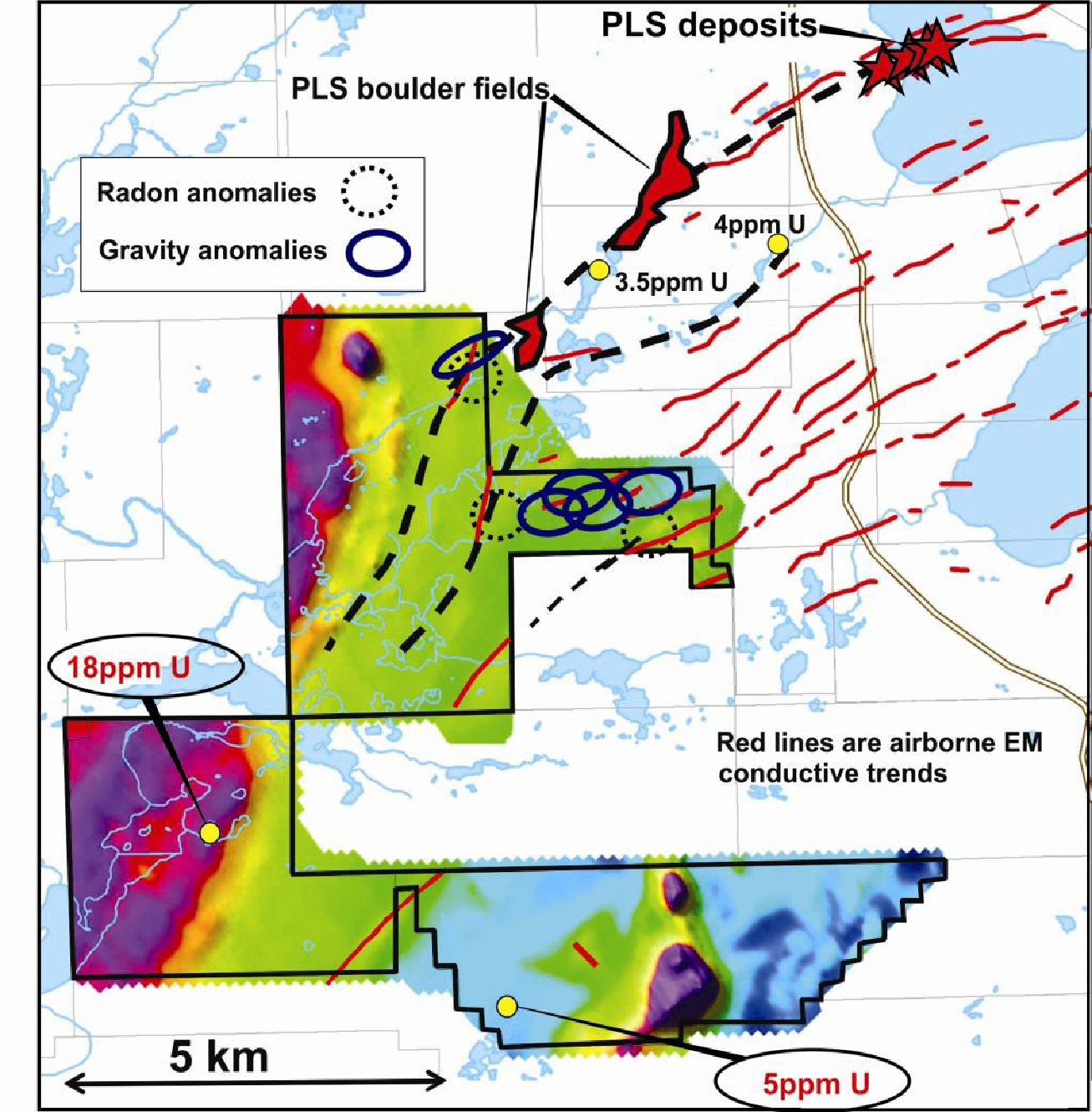 Figure 1: Gravity and radon anomalies with EM conductors on Forum’s Clearwater Project. Red lines are airborne EM conductors, black dashed lines are interpreted structural trends. The background colours are from an airborne magnetometer survey.