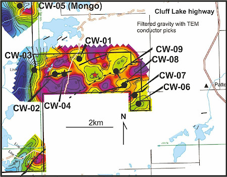 Figure 2: Drill hole locations on ground gravity background. Solid black lines are EM conductors, dashed black line is a major lithological contact. Hole CW-09 intersected strongly altered and corroded weakly graphitic pelitic gneiss with locally elevated radiometrics of up to 300cps. Hole CW-05 returned minor graphite, brittle/ductile breccia zones and a local radiometric peak of 300cps at 280m depth