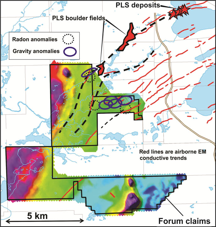 Figure 1: Gravity and radon anomalies with EM conductors on Forum’s Clearwater Project. Red lines are airborne EM conductors, black dashed lines are interpreted structural trends. The background colours are from an airborne magnetometer survey. Forum plans to drill the gravity, radon and EM targets in February.