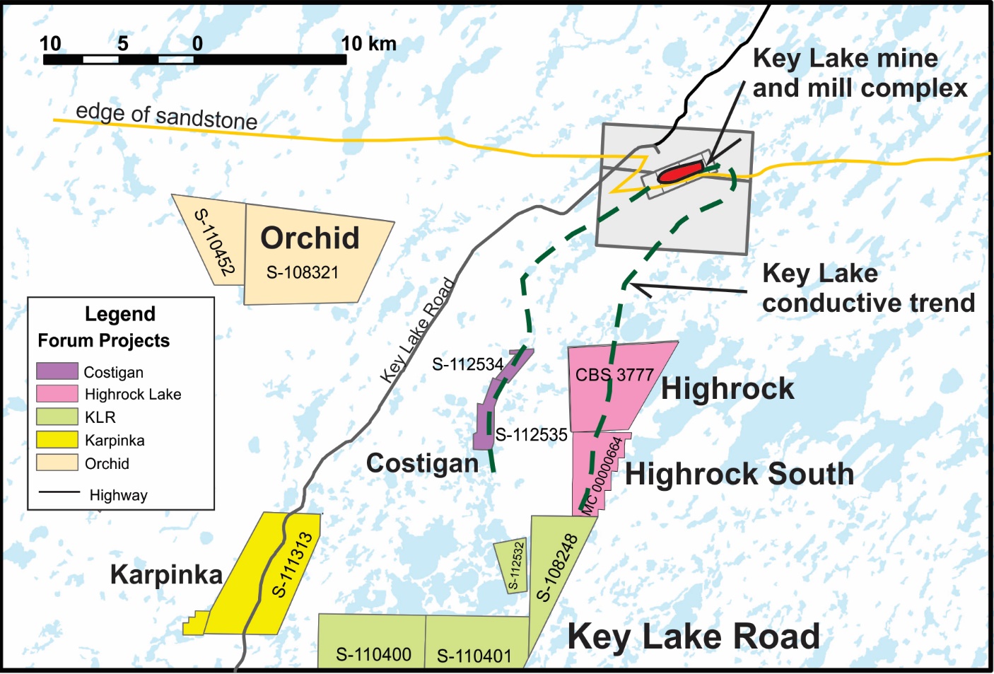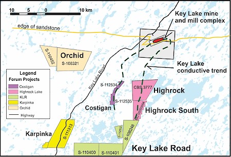 As the Highrock projects lie just outside the southern edge of the Athabasca Basin, the shallow, basement hosted targets are well within open-pit mining limits. Forum plans an eight hole - 1,500 metre drill program. Infrastructure in the Highrock area is excellent as the all-weather mine road and powerline to the Key Lake mill site runs approximately 10km west of the property.