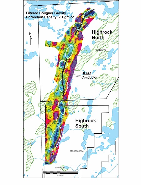 Figure 2: Ground Gravity Map of the Highrock Project. White ellipsoids mark target areas that are gravity lows (dark blue) in combination with long linear electromagnetic trends (black lines).