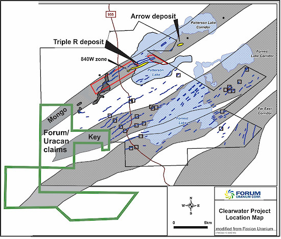Uracan can earn a 25% interest in the Clearwater property by spending $1.5 million (approximately $500,000 spent to date), a 51% interest in the Clearwater property by spending $3 million in exploration over three years and up to a 70% interest by spending $6 million over five years. The Clearwater Project covers a total of 9,912 hectares adjoining Fission Uranium’s Patterson Lake South claims to the southwest. Forum will be the Project operator until Uracan earns its 51% interest, after which Uracan may elect to become the operator.