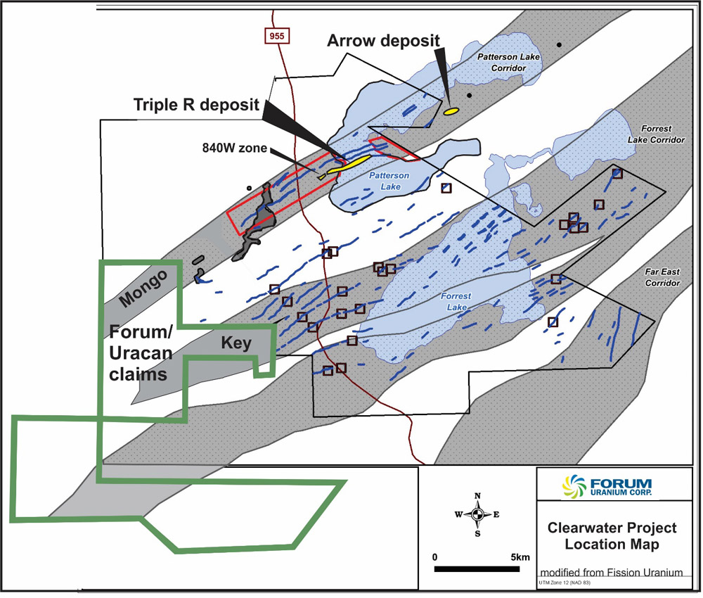 Uracan can earn a 25% interest in the Clearwater property by spending $1.5 million (approximately $500,000 spent to date), a 51% interest in the Clearwater property by spending $3 million in exploration over three years and up to a 70% interest by spending $6 million over five years. The Clearwater Project covers a total of 9,912 hectares adjoining Fission Uranium’s Patterson Lake South claims to the southwest. Forum will be the Project operator until Uracan earns its 51% interest, after which Uracan may elect to become the operator.