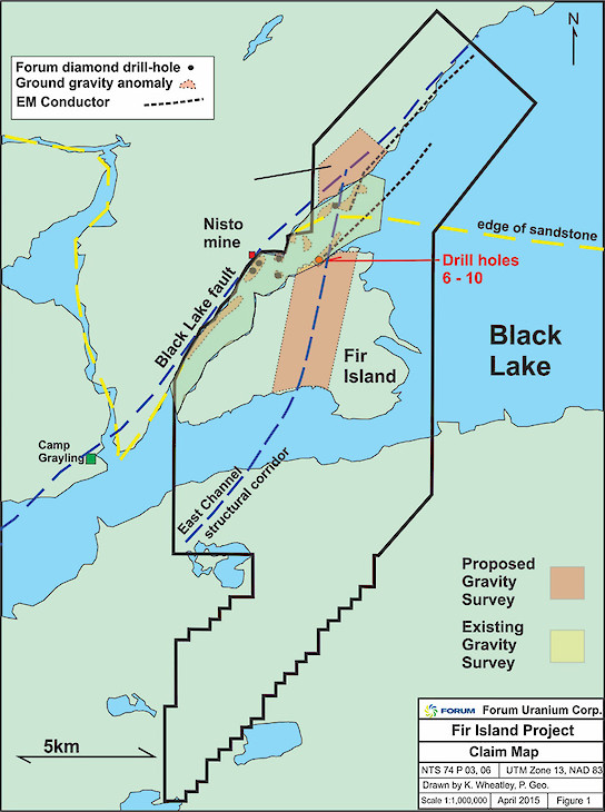 Vancouver, B.C., August 9, 2016 - FDC: TSX-V- Forum Uranium Corp. (“Forum” or the “Company”) has commenced ground gravity and soil sampling surveys on its 100% owned Fir Island Project to define drill targets along the East Channel Structural Corridor. Five holes from the 2015 drill program encountered intense alteration (quartz dissolution, dravite, hydrothermal hematite and sudoite alteration minerals) within sandstones over a major structural lineament with a 50m vertical offset of the unconformity. The sandstone cover to the unconformity with basement rocks is shallow, varying from surface (0m) to a depth of 200 metres on the Fir Island property. The East Channel trend occurs for over 18 kilometres on Forum’s property and the 2015 winter drill program tested only 50 metres of this strike length.