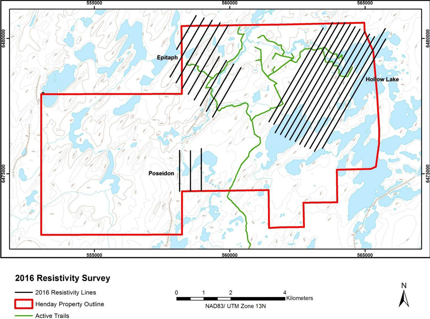 - Hollow Lake Block: Approximately 55.6 line-kilometres of resistivity surveying on 12 lines spaced at 200m; and