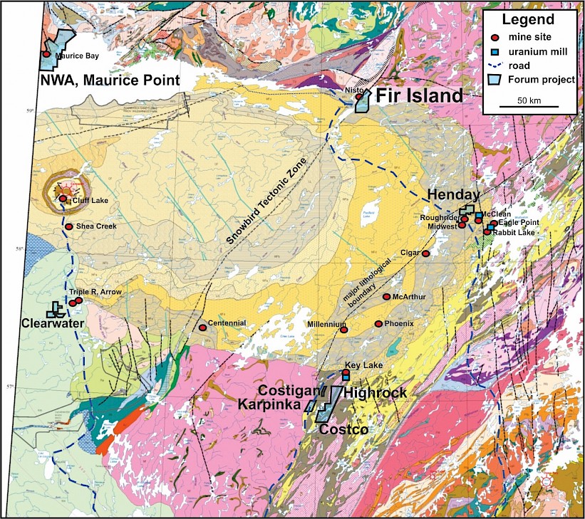 Figure 2: Location and Geology Map of the Fir Island Project. An all-weather road is present within 3km of the property and connects with the McClean Lake and Rabbit Lake uranium mills.