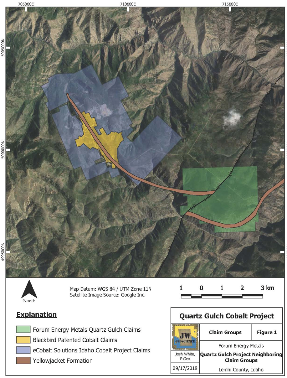 The Quartz Gulch claim block consists of 127 claims totaling 10.65 square kilometres, located approximately five kilometres to the southeast of the past producing Blackbird cobalt mine and the eCobalt Solutions Idaho Cobalt Project, the only permitted cobalt mine development in North America (Figure 1).