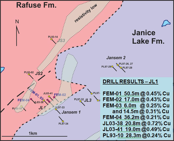 Figure 1: 2018 Drill Hole Location Map, JL1 Showing area. Copper has also been intersected in historical drilling at the Jansem 1, JL3 and Jansem 2 showings.