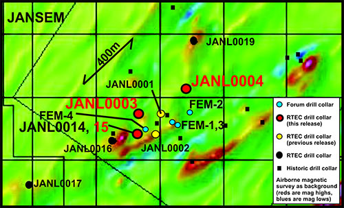 Figure 2: Drill Hole Locations on the Jansem Target Red dots are the three Rio Tinto holes reported in this release, yellow dots are holes previously released. The blue dots are the four Forum holes from 2018. Large black dots are 2019 Rio Tinto holes with assays pending and small black squares are historic holes.
