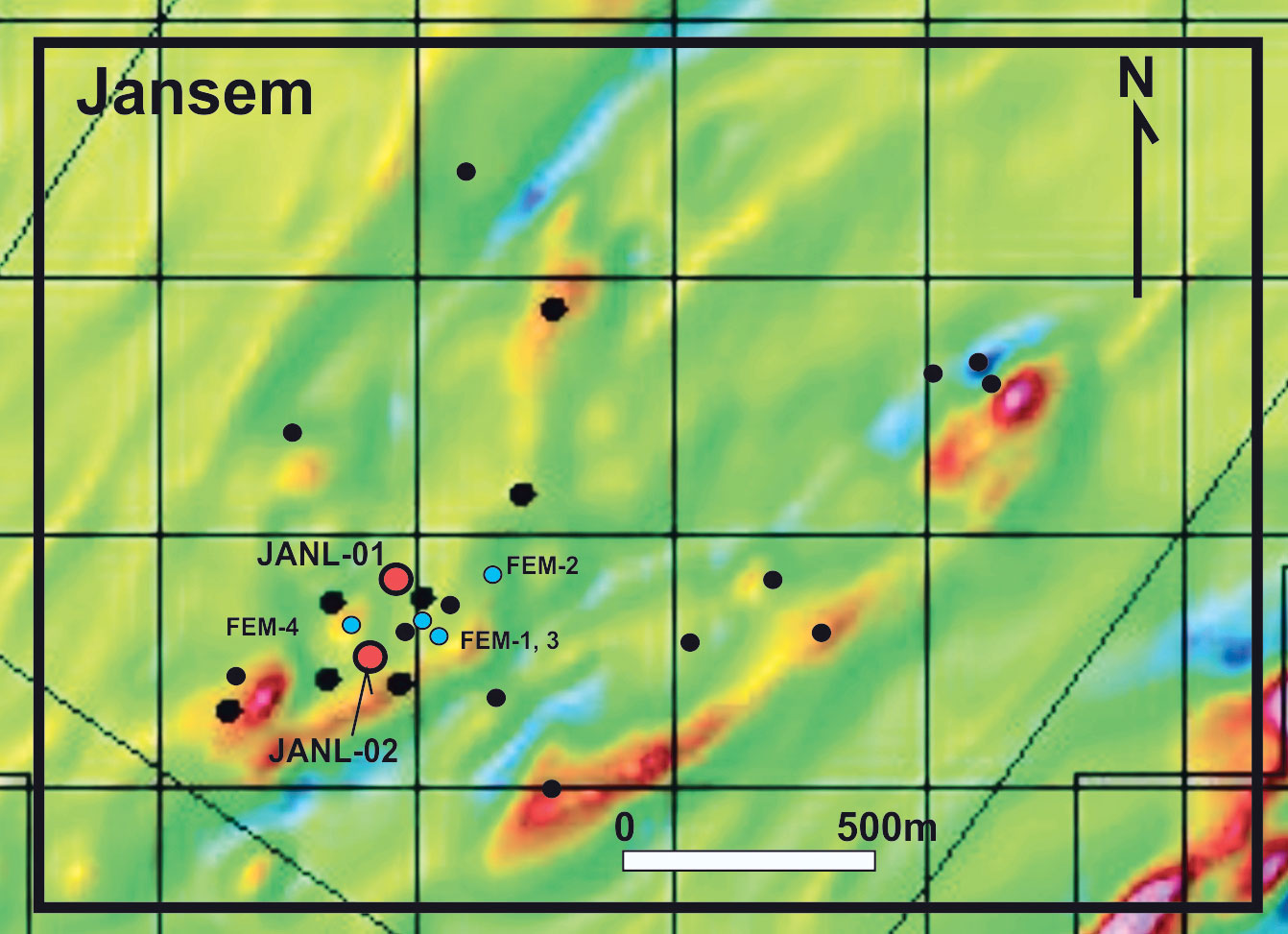 - Hole JANL0001 was drilled to a depth of 261 metres and intersected 0.18% Cu over a 63 metre interval between 19m and 82m. It is located approximately 100m to the north-northwest of FEM-01 to intersect mineralization down dip from the intercept drilled by Forum last summer of 18.5 m (59.0 to 77.5m downhole depth) grading 0.94% Cu and 6.7 g/t Ag including 5.2 metres grading 2.22% Cu and 16.5 g/t Ag.