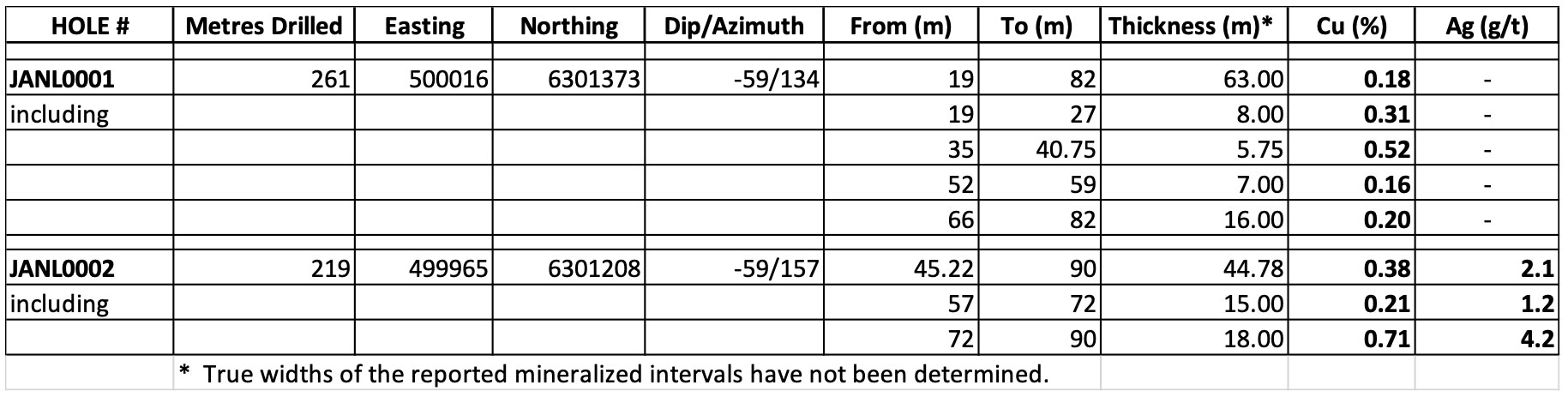 - JANL0002 - 0.38% Cu and 2.1g/t Ag over 44.78 metres from 45.22m to 90m, including 0.71% Cu and 4.2g/t Ag over 18 metres from 72m to 90m.