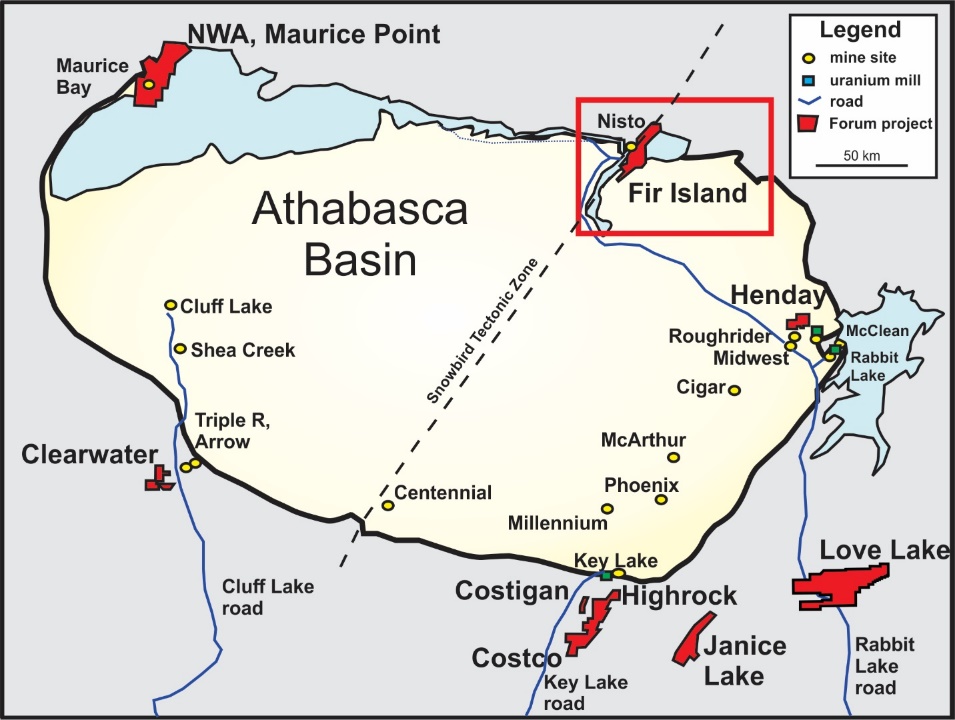 Figure 1: Location Map of Forum’s Exploration Projects in northern Saskatchewan. The Snowbird Tectonic Zone (dashed line) transects the Basin, and is associated with the Nisto U mine in the north, and Cameco’s Centennial U deposit on the south side of the Basin. This structure runs through the west side of the Fir Island project and is one of the target areas for the drill program.