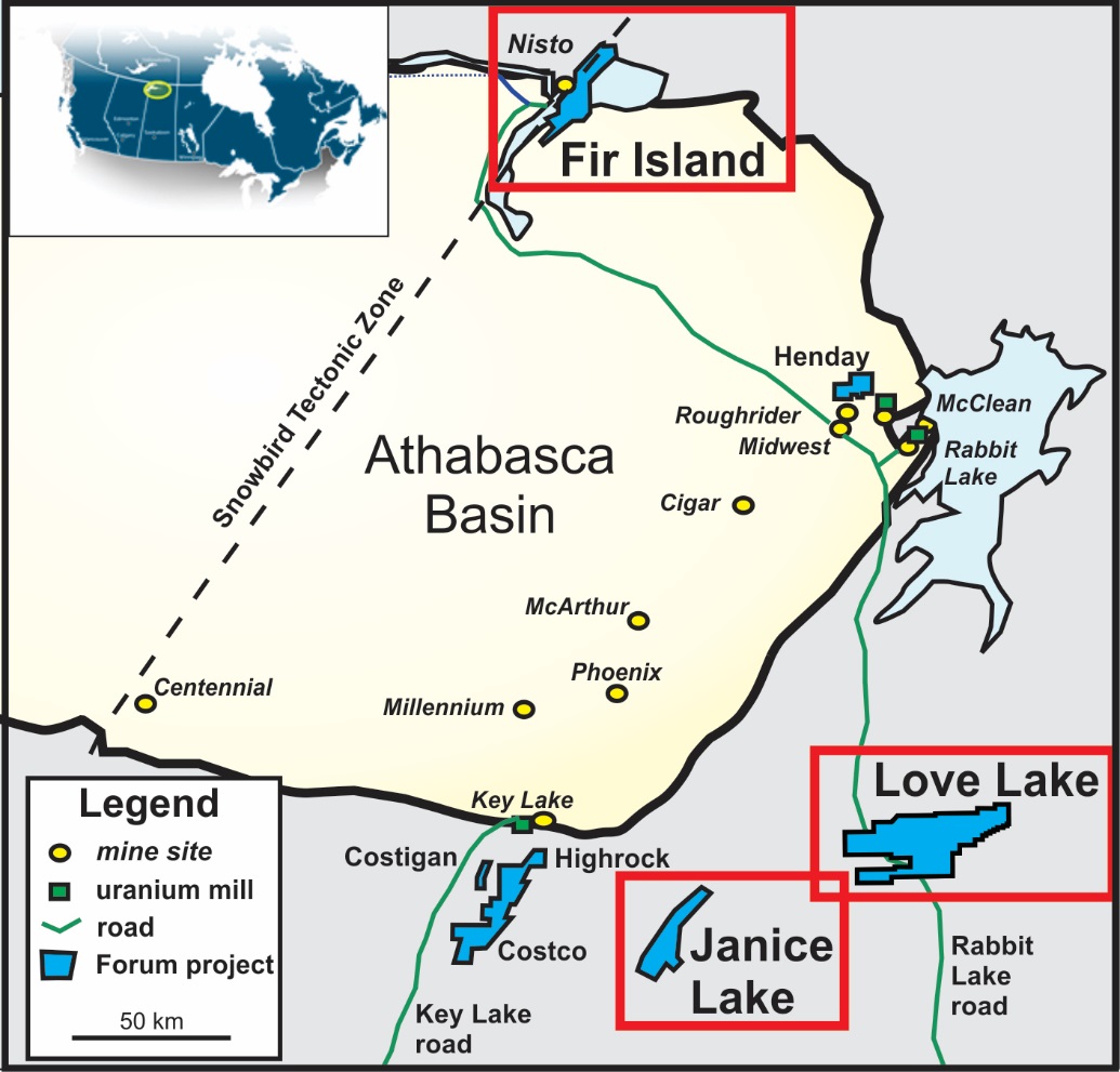 Figure 1 Forum plans exploration programs on three of its properties located in the eastern Athabasca region – Janice Lake Copper, Love Lake Ni-Cu-PGM and Fir Island Uranium.