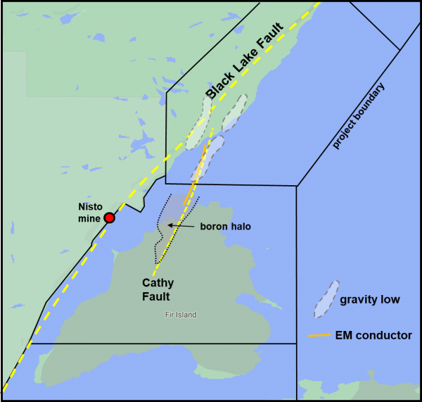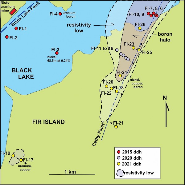 - Holes FI-23 to 26 at the north end of Fir Island all show elevated boron values (>100ppm) while the holes further to the south do not have these values. This suggests that the Cathy Fault / resistivity low to the north of the island is increasing in potential. Also, a historic EM survey has identified a conductor along this trend which continues 4km to the north to the intersection of the Cathy Fault with the major Black Lake Fault, one of the targets for the 2021 drilling that was delayed due to the poor ice conditions. This target also displays several large gravity lows, possibly due to alteration.