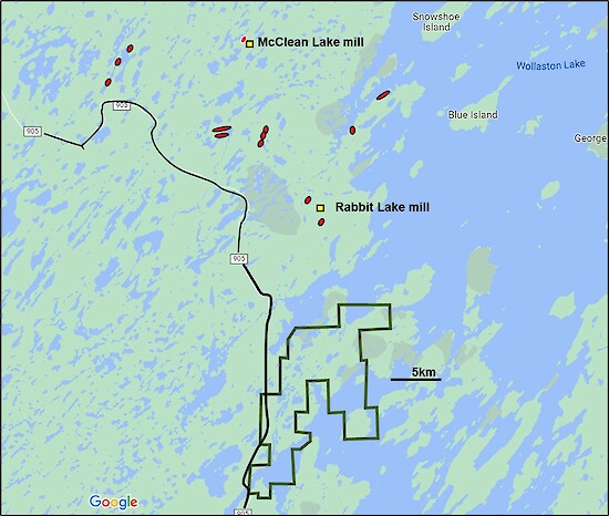Figure 2: Wollaston project is located on Highway 905, 10km south of Cameco’s Rabbit Lake Uranium Mill and 30km south of Orano/Denison’s McClean Lake Uranium Mill in the northeastern Athabasca Basin. Uranium mineral deposits are outlined in red.