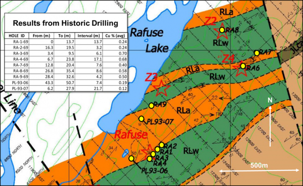 Drilling of nine holes at Rafuse in 1969 to a maximum depth of 62 metres returned up to 17 metres of 0.68% copper and two holes drilled in 1993 by Noranda to a maximum depth of 128 metres returned 21.7 metres of 0.19% copper (see Figure 1 and news release dated November 11, 2020). Two, one-kilometre lines of an Induced Polarization (IP) survey conducted by RTEC over the Rafuse target this summer identified a strong chargeability anomaly starting at a depth of 130 metres. The first two holes are planned to test this IP chargeability anomaly.