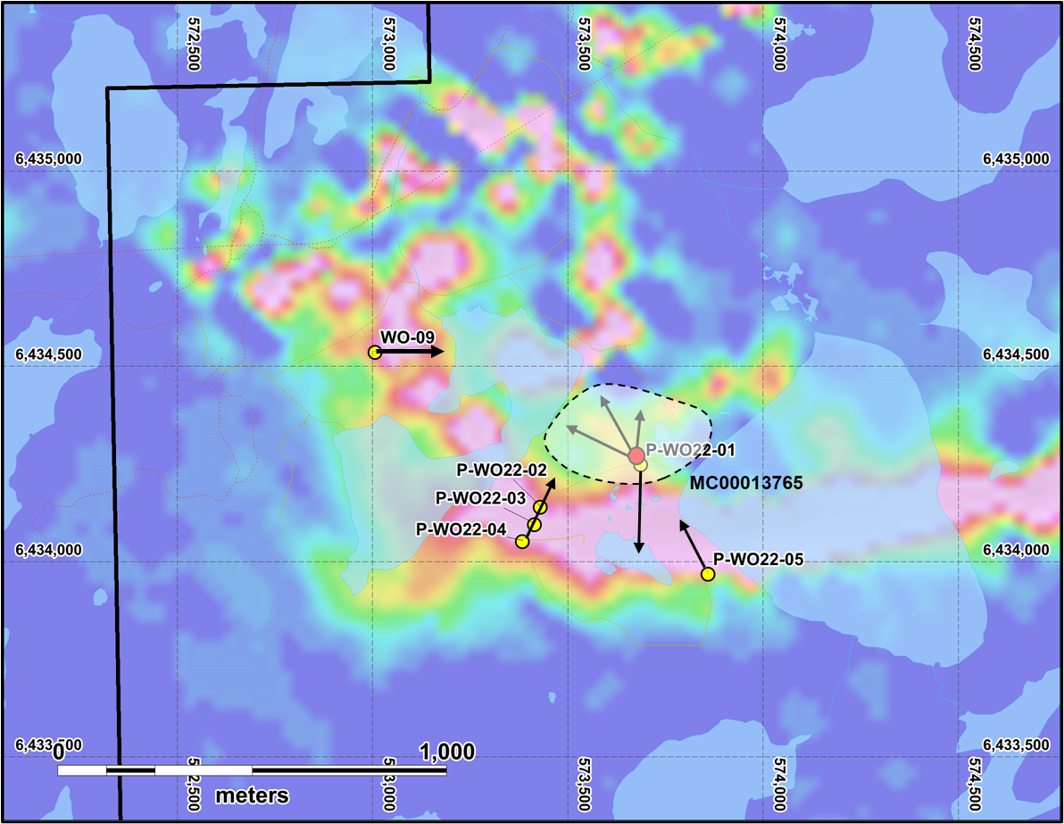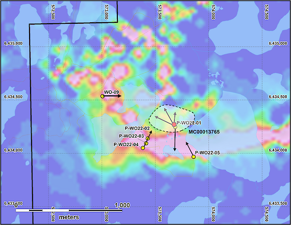Figure 2: Northwest Targets. The Gizmo gravity low (outlined in the dashed ellipsoid) lies immediately north of the strong conductor (shown in pink) delineated by this summer’s airborne survey. The original Gizmo holes from last winter are shown as a red dot. The yellow dots show the planned holes for the next month.
