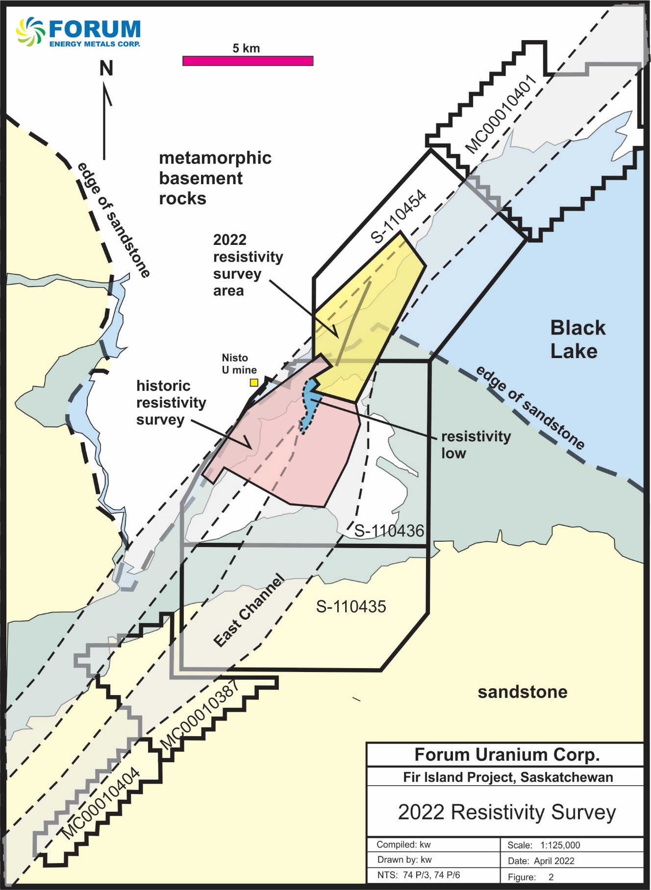 Vancouver, B.C., May 3, 2022 - Forum Energy Metals Corp. (TSX.V: FMC) (“Forum” or “Company”) is pleased to announce that an extensive resistivity survey has commenced on the Fir Island Uranium project under option to Orano Canada Inc. Orano is funding this $495,000 survey as part of its option to earn up to 70% of the Fir Island project by spending up to $6 million. Orano has funded two drill programs with Forum as Operator and upon completion of this program, Orano will have spent $3 million on the project to earn a 51% interest.