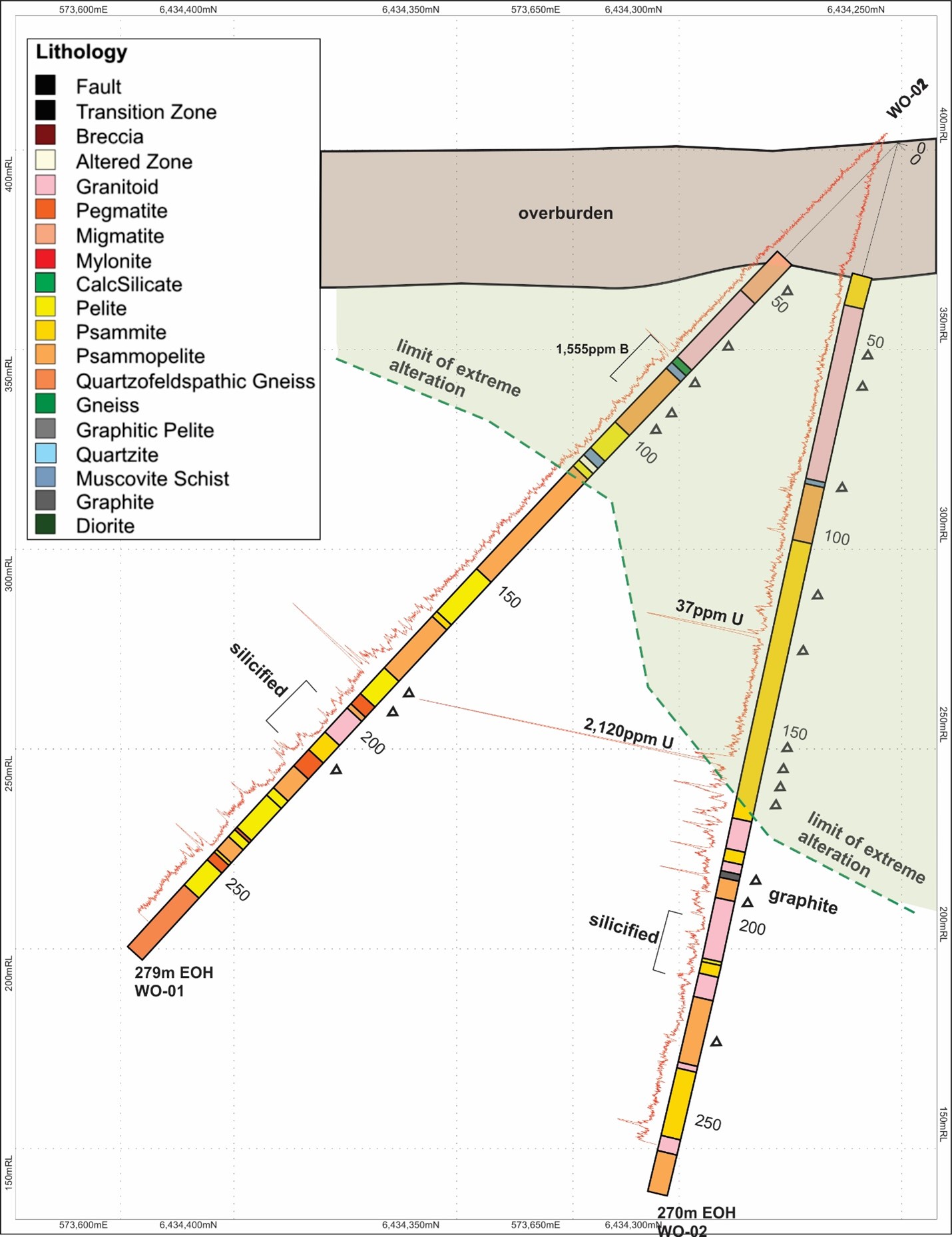 WO-03: 6.5 metres of 94ppm uranium; 287ppm boron from 101.6 to 105.4 metres depth