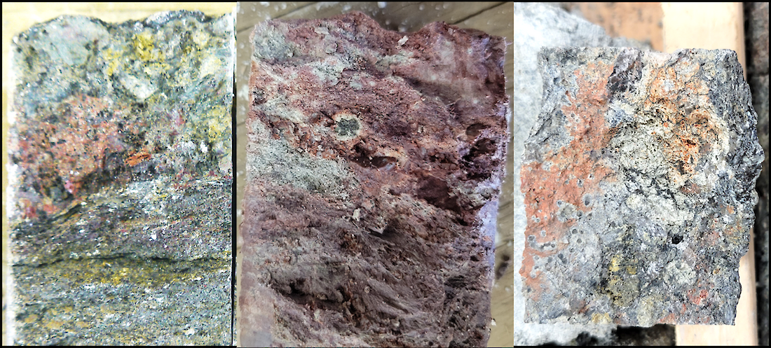 The sixth hole tested a weak gravity anomaly (Mugger) that returned relatively fresh calc-silicates and has been eliminated. The final two holes tested a third gravity anomaly (Stripe), also with an associated EM conductor that intersected a series of faulted units with associated gouges and local alteration. These holes have been heavily sampled and sent for assay.
