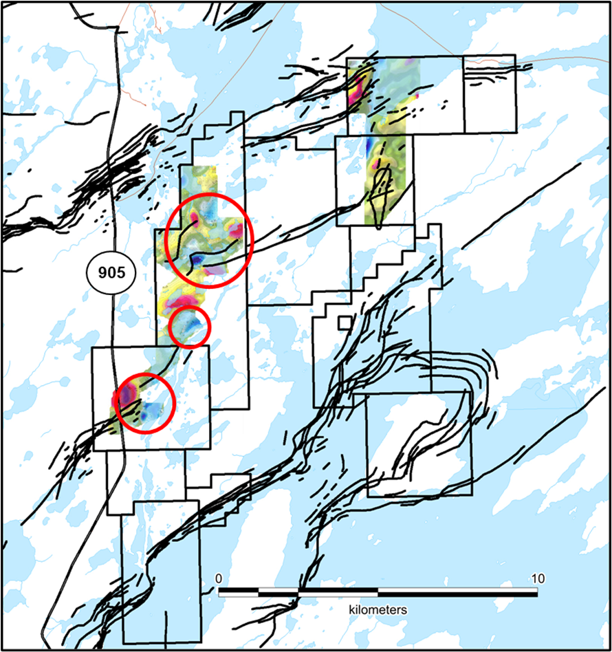 Figure 4: Gravity surveys completed over structural zones and EM conductors. Of the three target areas circled in red above, only the northern circle was investigated by the 2022 drill program.