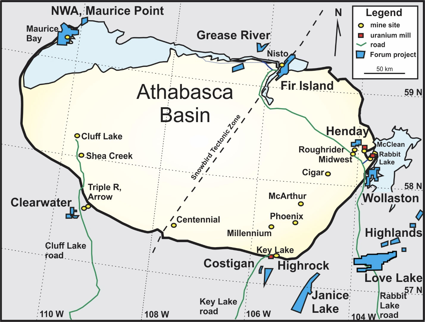 Figure 1: Location of Forum’s Wollaston Uranium Project, processing facilities (red squares) and roads in the Athabasca Basin, Saskatchewan, Canada