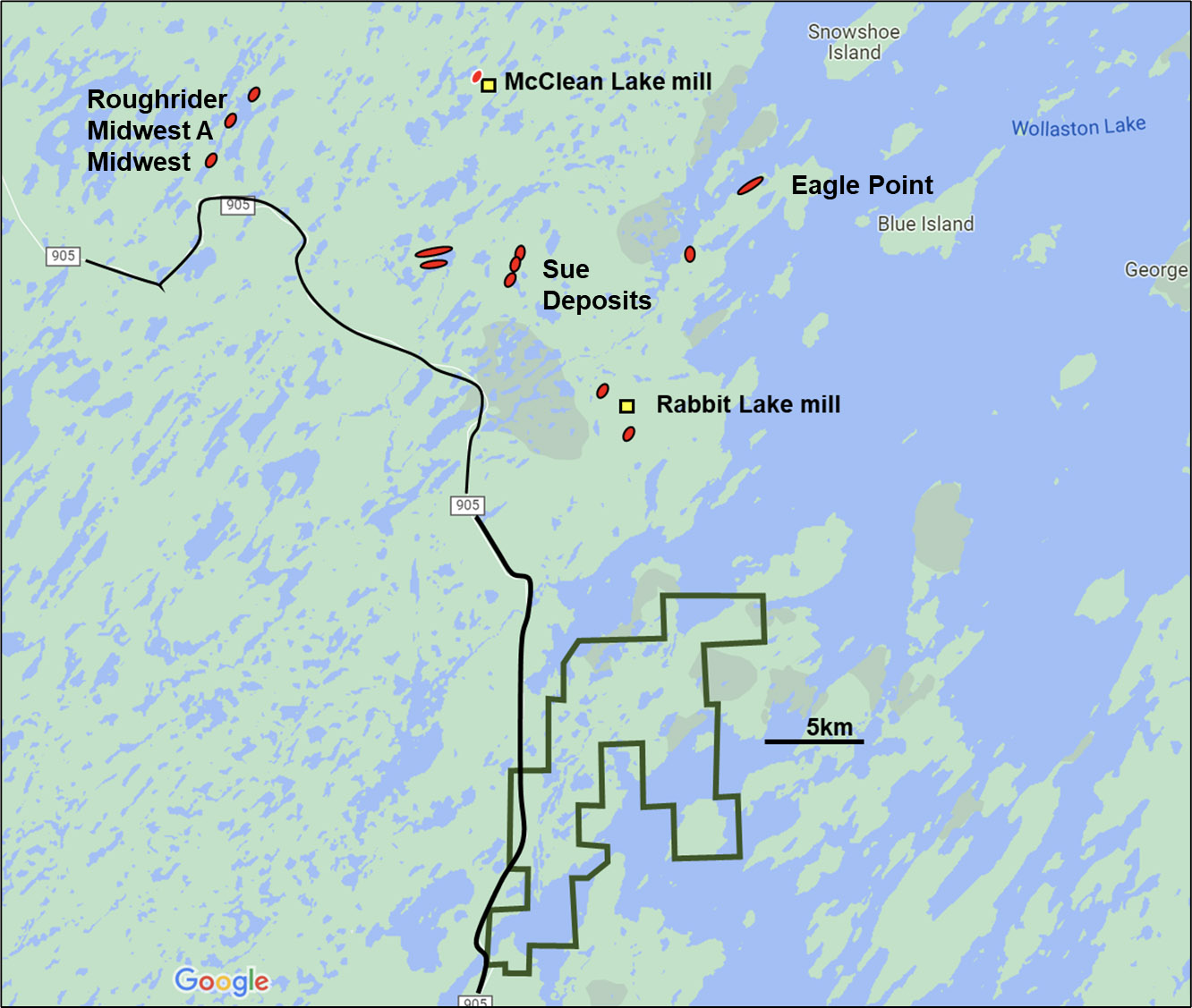Figure 2: The Wollaston project is located on Highway 905, 10km south of Cameco’s Rabbit Lake Uranium Mill and 30km south of Orano/Denison’s McClean Lake Uranium Mill in the northeastern Athabasca Basin. Uranium mineral deposits are outlined in red.