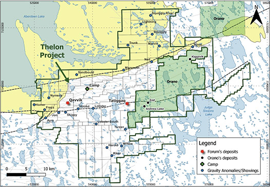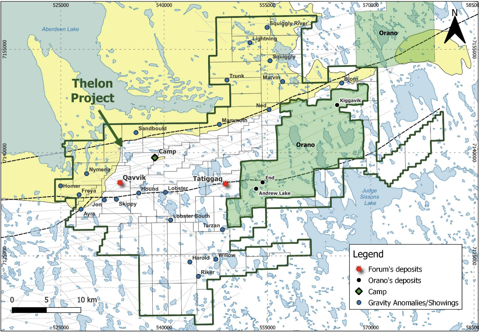 Figure 1 shows the main east-northeast structures (Thelon and Judge Sissons faults) as well as the numerous, sub-parallel subsidiary east-northeast structures interpreted to control uranium mineralization on Orano’s and Forum’s property. Figure 2 is a plan map of the Tatiggaq gravity anomaly and drill area.