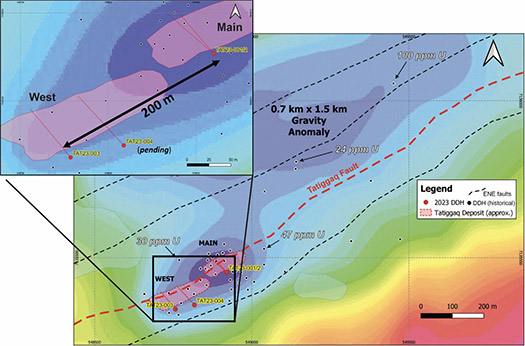 Figure 2 The Tatiggaq gravity anomaly showing the location of the Tatiggaq West and Main zones, historical drilling and the 2023 drill holes. Several of the historical drill holes have anomalous uranium values that require follow-up drilling. Inset Map: close-up of 2023 drilling.