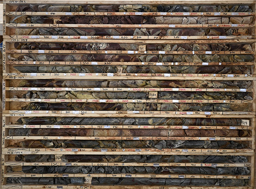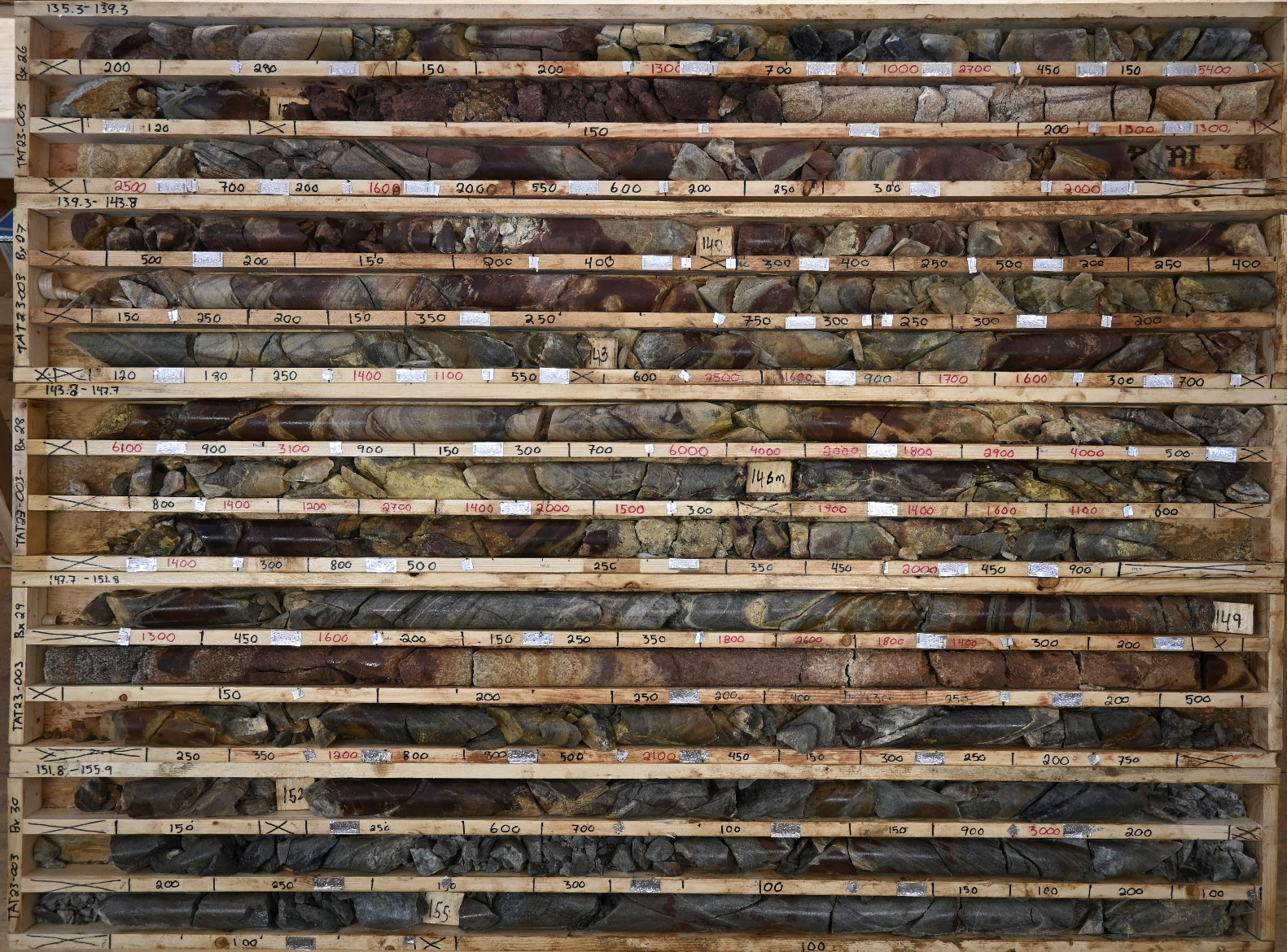 Figure 3 TAT23-003 drill core from the mineralized section (135.3 to 155.9 m). Scintillometer readings are written on the core boxes in counts per second and were measured using a digital, hand-held CT-007M scintillometer by Environmental Instruments Canada Inc.