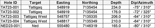 Mineralization within the Tatiggaq deposit consists of two zones - the Main and West Zones and is located at depths between 80 and 180 m. The mineralization is hosted in a series of high-grade subparallel, steep, south-dipping fault zones that sit within a 50 m wide area. Individual high-grade mineralized structures are up to 10 m in width. The strike extent of the Main Zone is at least 60 m but is open to the northeast and the West Zone is now 150 m in strike length and is open to the southwest. Further delineation is required between the two zones to determine if they are connected. In addition, the entire 0.7 km wide by 1.5 km long Tatiggaq gravity anomaly remains open for additional uranium mineralization both along strike of the known zones but also along numerous sub-parallel fault zones to the north and south of the main Tatiggaq trend. Table 1 and Table 2 show the drill and assay data respectively.