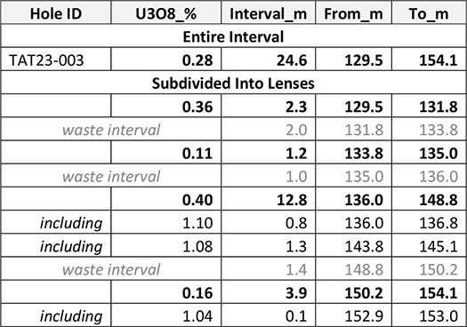 - TAT23-003 (West Zone) intersects 0.40% U3O8 over 12.8 m (136.0 – 148.8 m)