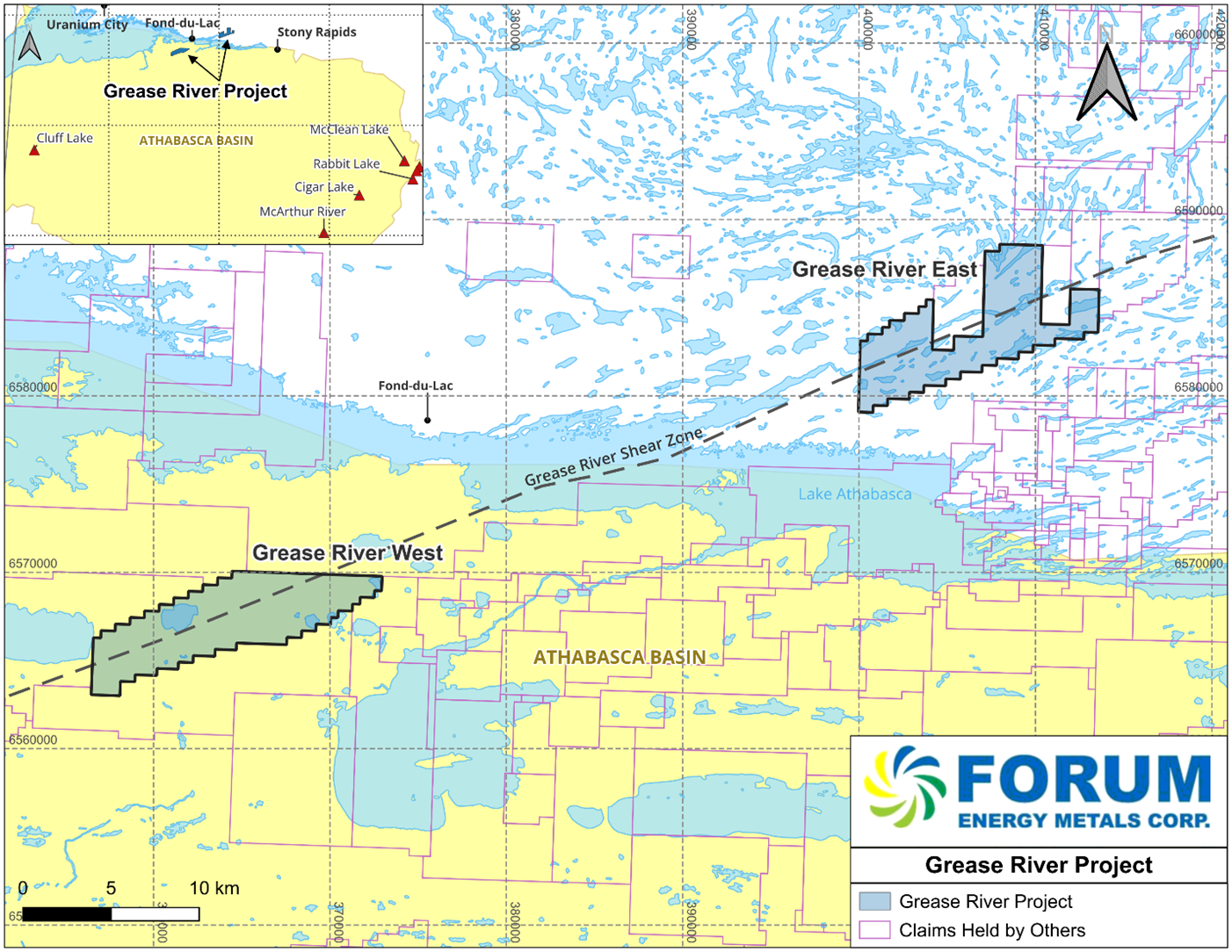 Figure 1. Location of the Grease River Project (West and East claim blocks) in northern Saskatchewan. The closest community is the hamlet of Fond-du-Lac, which is located between the two claim blocks. The southern claim block rests within the Athabasca Basin and the northern claim block is outside the Athabasca Basin. Dashed line is the Grease River Shear Zone, a major shear system that extends for over 400 km. Unconformity uranium deposits are structurally controlled, fluids from under the Athabasca sandstone basin carrying uranium along the faults. Forum and Traction see this structure as a possible major fluid conduit that has the potential to host a significant uranium deposit.