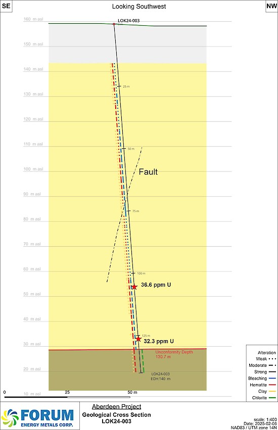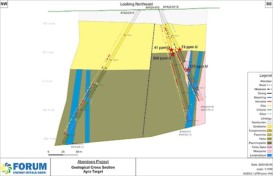 Vancouver, B.C., February 18, 2025 – Forum Energy Metals Corp. (TSX.V: FMC; OTCQB: FDCFF) (“Forum” or the “Company”) announces drill results for the Ayra, Loki and Ned grids. The Ayra and Loki grids host strong clay alteration and elevated uranium values up to 72.8 ppm in the sandstone and 323 ppm in the basement. This is the first evidence of major unconformity-style uranium mineralization at the sandstone/basement contact in the Thelon Basin. These targets have the potential for the discovery of Tier One uranium deposits similar to those found in the Athabasca Basin.