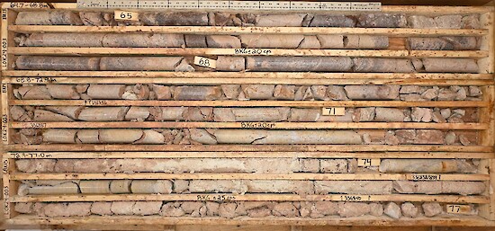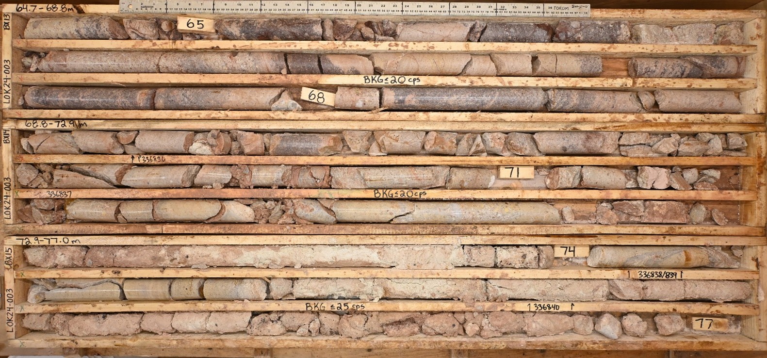 Figure 4 Core photo of LOK24-003 showing the intense clay alteration in the sandstone around 70 m.