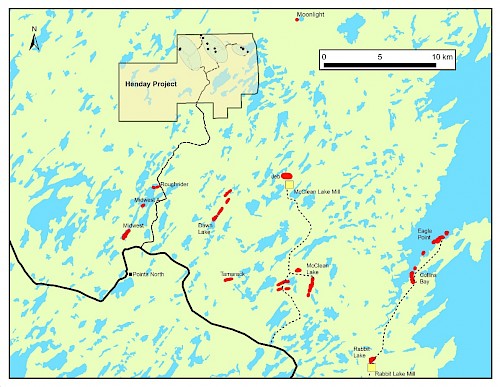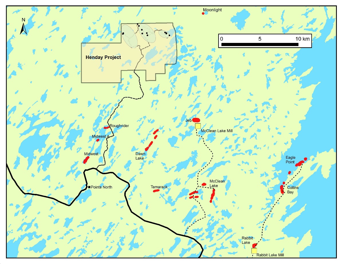 Henday is located in the northeastern margin of the Athabasca Basin near the past producing McClean Lake projects, where five out of nine known uranium deposits were mined by AREVA/ Denison from 1997-2008. Access is by both winter roads or trails connected to Provincial Highway 905 and by air to the community of Points North Landing, located approximately 30km south of the Property. |