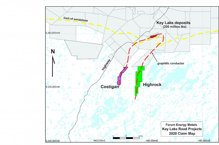 Forum’s Key Lake Road project comprises two separate properties: Highrock and Costigan. The properties are located south of Cameco’s Key Lake deposits, and are underlain by rocks that host all the known uranium deposits in the eastern Athabasca Basin. The two projects host the graphitic conductor that hosts the Key Lake deposits, with Costigan hosting the west side of the conductor, and Highrock the east side. Targets along the conductor are determined by cross-cutting structures and gravity lows that may signify alteration. Both projects lie just to the south of the Athabasca sandstone limit, so the target is basement-hosted uranium mineralization.