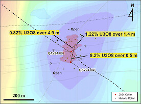 The Tatiggaq drill interpretation summary, assay tables, geological cross-sections, and Hole TAT24-014 core photo can be reviewed in the link below. 2. Qavvik: Located 15 km west of the Tatiggaq deposit, two holes were completed to test uranium mineralization interesected by previous drilling conducted by Cameco in this 800mx800m gravity low anomaly. A 296m wide zone of shallow uranium mineralization with high grades of up to 8.2% U3O8 were intersected in a newly identified lense. Mineralization is open to the northeast and southwest. Hole QAV24-001 intersected a 296m wide zone of uranium mineralization comprising numerous discreet lenses from 36m-332m. Hole QAV24-002 intersected over 190m of discreet uranium mineralized lenses from 192m-384m.