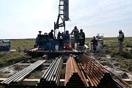 Examining drill core at the Aberdeen base camp Exploration History During the period 2008-2012, Cameco drilled 135 holes totaling ~36,000m to the west of Kiggavik and discovered two uranium deposits - Tatiggaq and Qavvik. A significant showing named Ayra was also discovered. Tatiggaq Uranium Discovery The Tatiggaq discovery, found in 2010, consists of two zones: the Main and West Zones, which average 30m in thickness at a shallow depth of 80-100m, and strike lengths of 80m and 60m respectively. Discovery Hole TUR-014A intersected 0.85% U3O8 over 13.7m and 4.03% U3O8 over 0.5m. Grades of up to 24% U3O8 over 10 -30 cm widths with average grades of approximately 1% U3O8 were reported over these two mineralized zones. The deposits remain open along strike and at depth within a large gravity anaomaly (0.8 X 1.5km) that is not fully tested.
