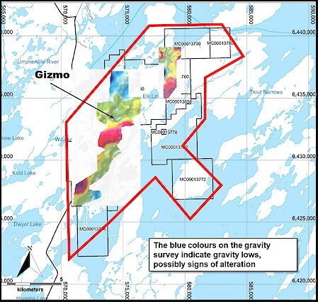 - 7 holes totaling 2031m were completed along the Gizmo trend. Assays returned anomalous uranium values between 95 and 444pm with coincident elevated boron up to 900ppm within weak to moderate clay alteration. Future drilling will focus along this trend including a newly identified strong 750m long gravity low to the east. Drilling was unable to test this anomaly due to winter access challenges that will require helicopter support.